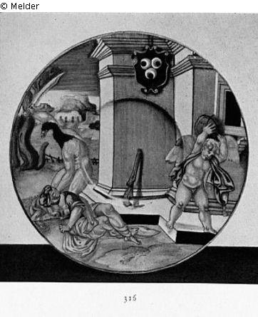 in Gelb, Ocker, Blau und Grün bemalt, mit Weiß gehöht. Ober die ganze Fläche gemalt allegorische Darstellungen des Sacco di Roma. Vor einer Landschaft und einem Architekturteil erschlägt links ein Mann mit Adlerkopf eine am Boden liegende Frau, rechts steht ein Amor, der einen Globus auf den Schultern trägt. An einem Mauervorsprung, an dem eine Keule lehnt, hängt ein Wappen. Auf der Rückseite in blauer Schrift "Dal fortunaro Carlo Roma afflitta" "nora". Ein Stück der gleichen Serie im Schloßmuseum, Berlin.