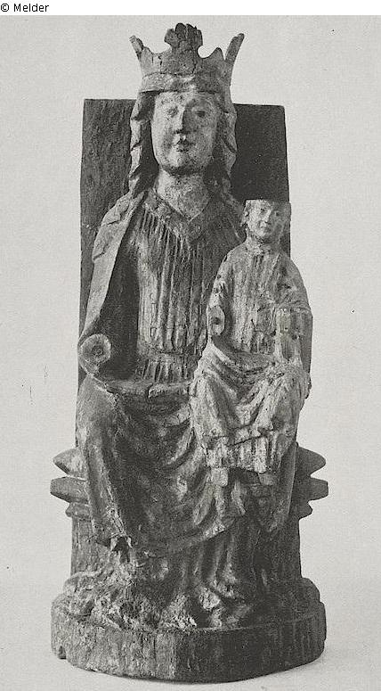 Ganz frontal ausgerichtet. Auf dem zurückgebundenen Lockenhaar Krone. Blauer Mantel über glattem roten Gewand. Der Kopf des Christuskindes abgeschlagen. Holz geschnitzt. Rücken ausgehöhlt und abgeflacht;