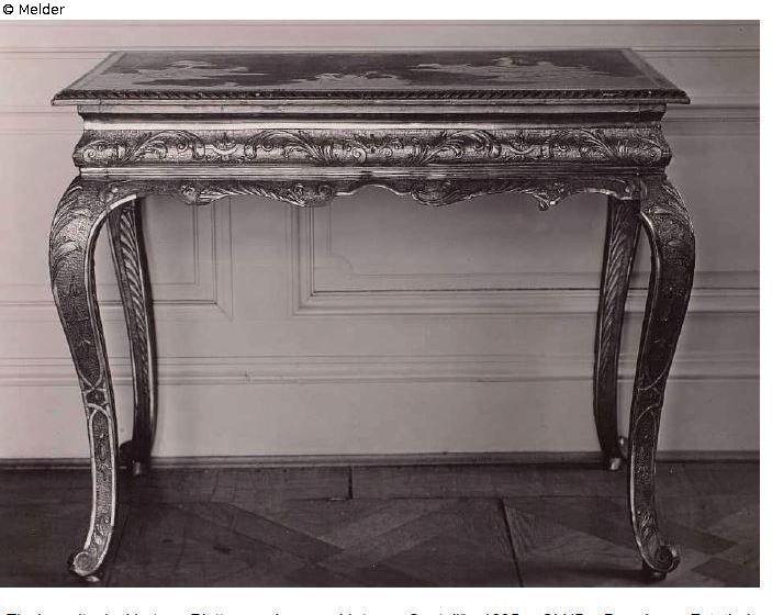 Die Tischplatte lässt eine Lackarbeit mit einer Landschaftsdarstellung erkennen. Es kann nicht abschließend beurteilt werden, ob es sich dabei um eine asiatische Arbeit oder eine sächsische Imitation gehandelt hat. Vergleichbare Arbeiten, auch im Möbelbestand des sächsischen Hofes, werden Martin Schnell (1675-1740) zugeschrieben.