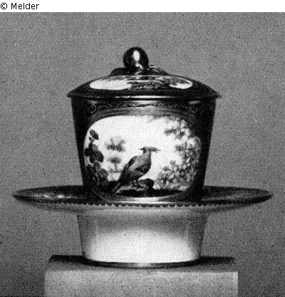Katalog Hans W. Lange / Auktion 18.-19.11.1938, Kapitel "Porzellan. Ausländische Manufakturen", S. 102: "746. Trembleuse. Konische Form, Henkel aus Zweigen gebildet. Königsblauer Fond, darin ausgespart ovale Medaillons mit exotischen Vögeln in Landschaften. Reicher radierter und reliefierter Golddekor, Netzwerk, Blütenzweige, Schweifblätter und Rosetten. Doppel-L-Marke, Jahresbuchstabe N und Malermarke des Tiermalers Aloncle. Sèvres, 1765. H. 10 cm, Durchm. der Tasse 8,5 cm, Durchm. des Tellers 15 cm. Tafel 44."