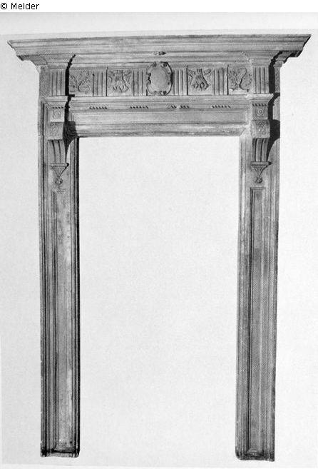 Zwei Seitenpilaster profiliert mit einer konsolartigen Volute oben. Der Sturz mit Fries, zwei Triglyphen, zwei Eichenzweige und zwei hängende Fruchtbündel, in der Mitte ovale Kartusche. Abbildung Versteigerungskatalog Tafel 33