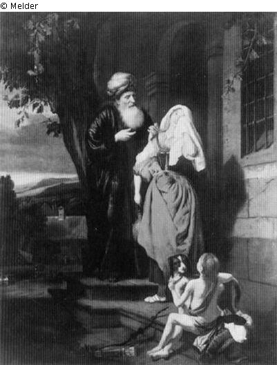 Tafelmalerei: Bild: die Verstoßung Hagars und Ismaels (Genesis 21:9-21); verbannen; Hagar; Ismael