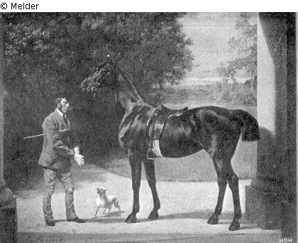Vor einem schwarzbraunen Engländer steht der Reitknecht im Begriff, sich die Handschuhe anzuziehen; Rahmen: Außenmaße: 80 x 92 cm; Kunstwerke im Hause Raussendorff, dargebracht von Dr. Hugo Raussendorff und Franz Weinitz. Berlin 1895, Kat. Nr. I-65;