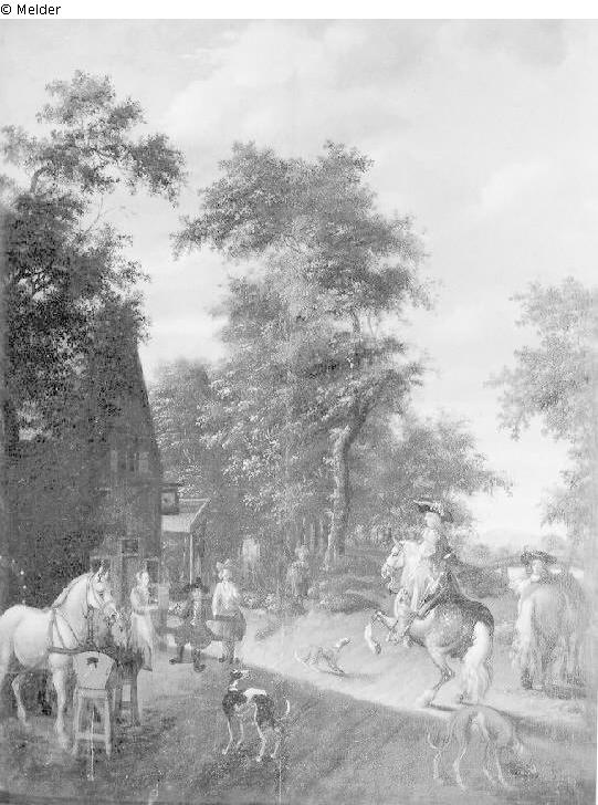 Vornehme Reiter mit Hunden rechts, links das Wirtshaus mit Staffagefiguren, Bäume im Hintergrund. Breiter Rahmen.