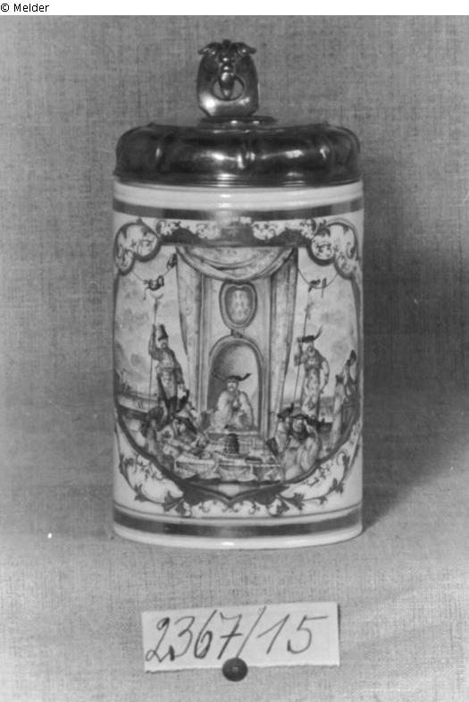 Muller & Cie: Walzenkrug mit polychromen und goldenen Dekor, einen chinesischen Herren auf seinem Thron von seinen Dienern begleitet darstellend. Deckel silbervergoldet, trägt eine Medaille, auf jeder Seite ein Porträt mit lateinischen Inschriften. Gerissen. Höhe 18,5 cm.