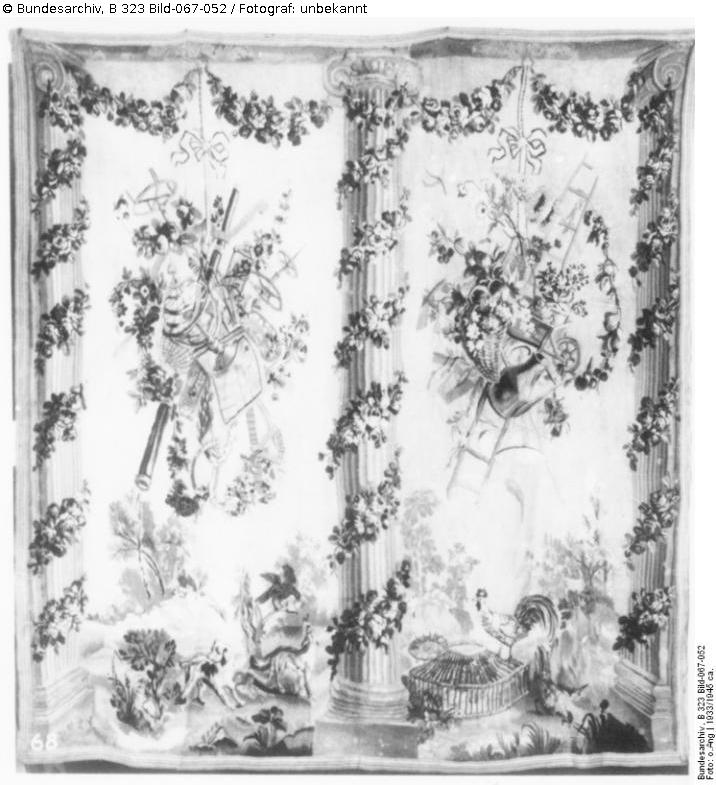 Französisch, 1. Hälfte des 18. Jhrd., Epoche von Louis XV.; 225 x 210 cm. Darstellung von Säulen und Blumen, nach Lafontaine-Fabeln nach einer Mappe von Oudry.