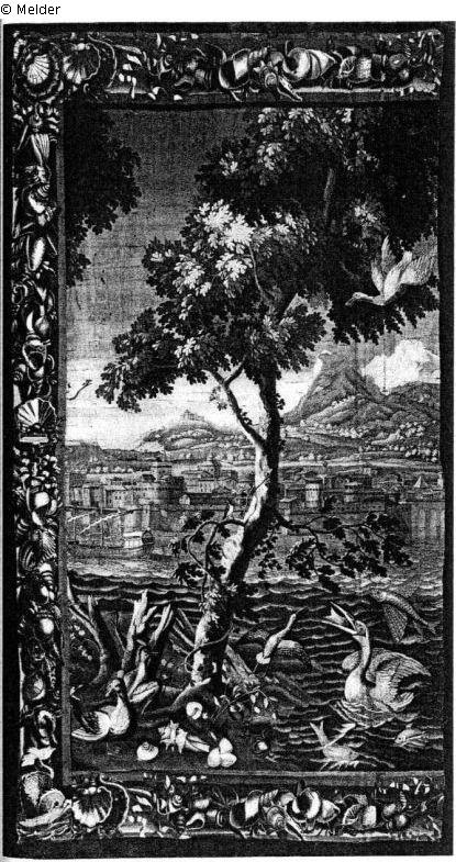 Hafenlandschaft. Befestigte Stadt am Seeufer vor Bergen. Auf dem Wasser Galeere. Vorn Bäume, ein Pelikan, Wasservögel, Fische. Muschelborte. (Rechte Borte fehlt, linke angenäht.) Teilstück zum folgenden. Vgl. Wandteppiche der Manufacture des Gobelins, Werkstatt des Jan Jans d.J.: Göbel, Wandteppiche in romanischen Ländern, Taf. 76 und 77.