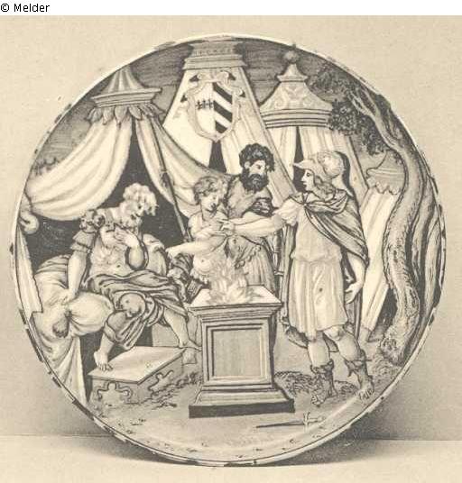 A FINE URBINO ARMORIAL TAZZA, by Fra Xanto Avelli, brilliantly painted with a representation of the story of Mucius Scaevola and King Porsenna, in the background the tents in the camp of Porsenna, at the top of one of the tents a coat-of-arms, the reverse inscribed within the foot rim " 1534. Mutio che la sua des tra err ate cuoce ", signed "Fra: XatodeRovigoi Urbino ", 1534