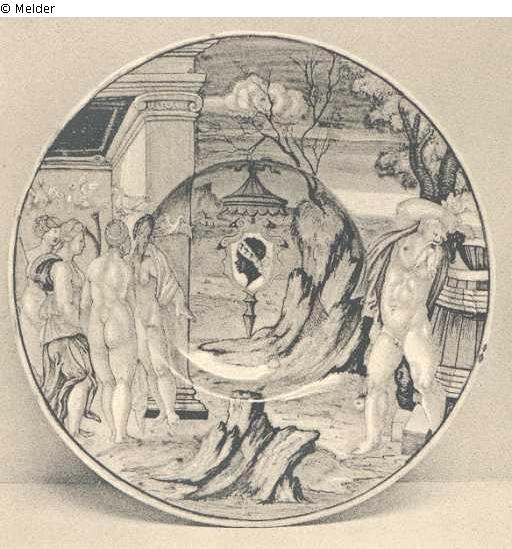 AN URBINO ARMORIAL TONDINO, by Fra. Xanto Avelli, decorated in the centre with the Pucci arms and against an architectural and landscape background with a figure of Bacchus on the right, and the Daughters of Anius, King of Delos on the left being changed into doves by Bacchus when they objected to Agamemnon's request {Ovid. Met. XIII, v. 642-673), the reverse of the plate inscribed in blue " 1532 • Dil Re Anio le figlie i piu Colombe. Nel. XIII L ? d'Ouidio Met: Fra: Xanto A. da Rovigo, I Urbino ", circa 1532