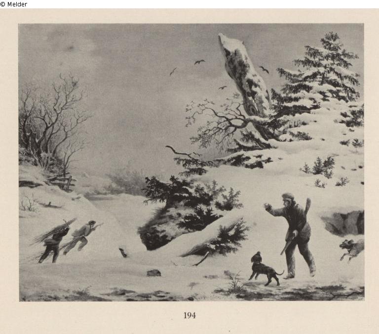 Winterlandschaft mit Jägern und Hunden