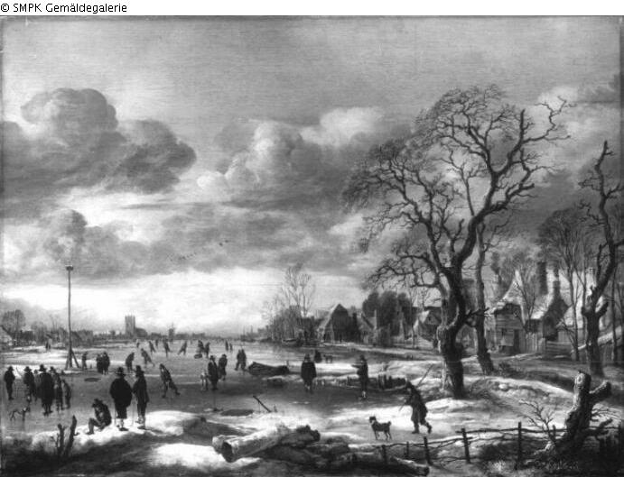 Tafelmalerei: Bild: menschliche Tätigkeiten im Winter (bei der Einteilung des Jahres in vier Jahreszeiten) : Wintersport; Winter; Tätigkeiten : Winter; Wintersport; Schnee; Eis(-decke, -schicht); Bez. unten links; Signatur: AV (verbunden) DN (verbunden); Maße: 59 x 82 cm