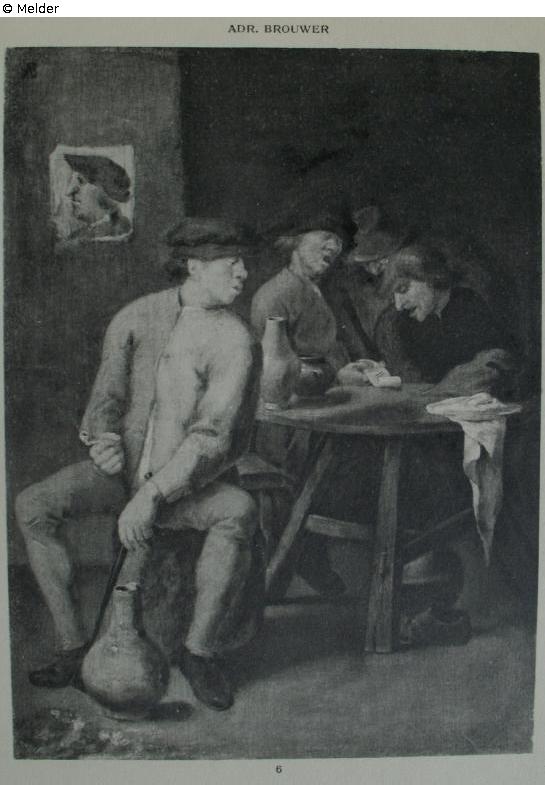 wahrscheinlich eines der allerersten Bilder von Brouwer (Pantheon 1930. S. 278). Drei Bauern in blauer, brauner und grauer Kleidung singend an einem runden Tisch. Ein weiterer Bauer sitzt mit Pfeife vor dem Feuer, vor ihm ein Krug.