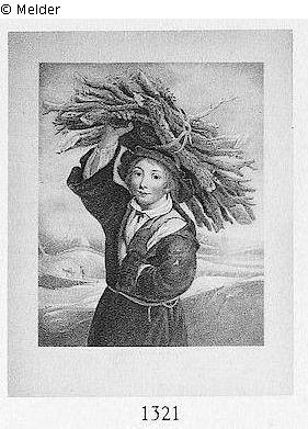 Ein Knabe mit einem Holzbündel auf dem Kopfe steht in einer Winterlandschaft. Farbdruck mit breitem Rande. Fol. Gerahmt.