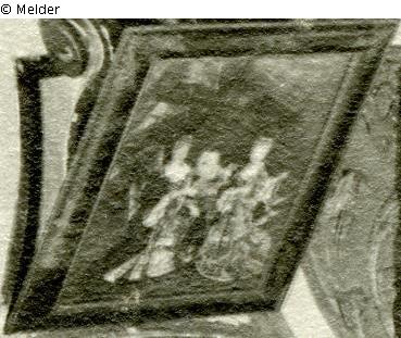 Zwei Damen sitzend, Kind in der Mitte, vermutlich im Holzrahmen mit chinoisem Lackdekor; zugehörig zu einer Serie von Kostümbildern im Spiegelkabinett von Schloss Favorite; Vergleichsabbildungen siehe: Externer Link