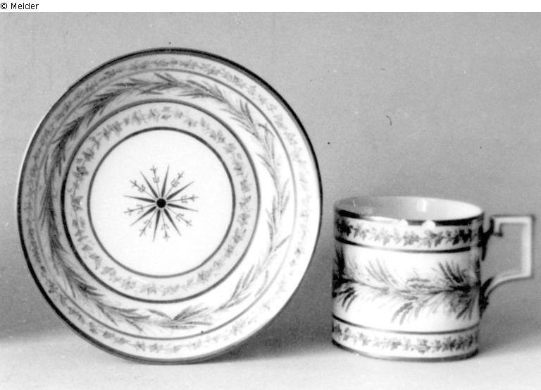 Dekor: Kornähren und Wicken in kreisförmigen Bändern umlaufend. Szeptermarke Nr. 12 in rot.