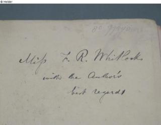 4th edition; on pastedown with pencil: [a hardly legible abbreviation]; on the flyleaf with pencil: 80 11542 [?]; with ink in black dedication of the author to the owner: Miss L. R. Withlock [?] with the authors best regards; on the back pastedown with pencil: 30; lable: Bound by Bone & Son. 76 Fleet Street London [lable of the time of origin]