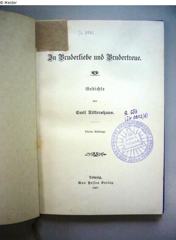 Auf Vorsatzblatt: No. 108 [schwarz], auf Titelblatt: IG 0802 [grau], [1 überklebte Nummer], R. 559 (IG 0802/8) [Große Freimaurerloge Zu den alten Pflichten], auf hinterem Vorsatzblatt: 68 [rot], Stempel "Kartei notiert" + [unleserliches Kürzel]