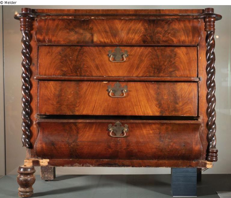 The chest of drawers is in very poor condition. The top is slightly bowed, water stains cover the surface, there are some veneer repulsions, cracks on both cheeks, anobia pitting in several softwood parts and a front stand is broken off. It has three drawers with more recently refinished brass handles and is supported on both sides by turned columns. Stylistically, it is a historicist version of a so-called Louis XIII commode, recognisable by the plain and somewhat chunkier Renaissance style elements. The veneer technique clearly refers this chest of drawers to the 19th century or the Gründerzeit.