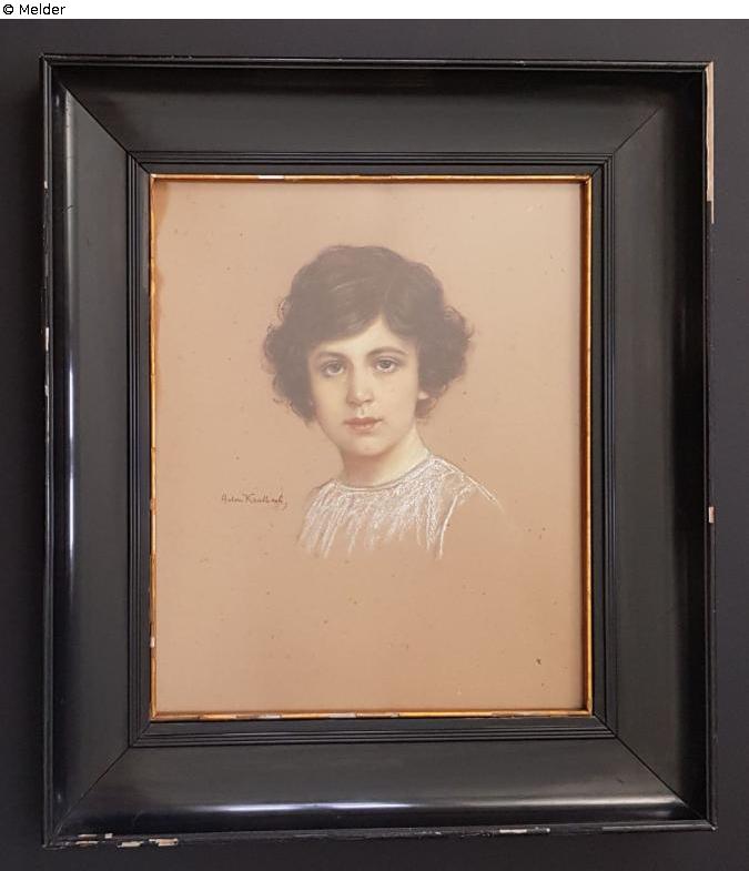finely crafted portrait of a child with dark curly hair and a white shirt against a neutral background on yellow cardboard; stable condition; framed, signed (‘Anton Kaulbach’)