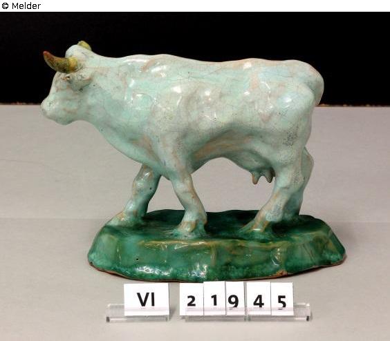 Animal sculpture Cow, design and manufacture Emil Potter (1872-1927). Cow standing on irregularly shaped plinth. Cow glazed light green, red shards translucent, horns glazed yellow, plinth glazed dark green.