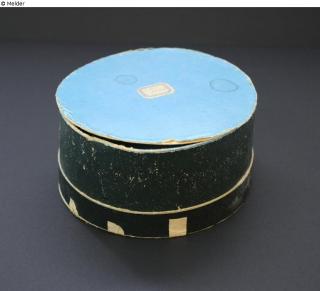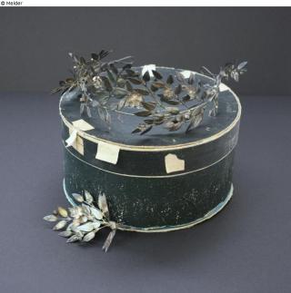 Diadem for the bride in the form of myrtle branches with leaves, flowers and berries; accompanying pin for the groom. In original box of colored cardboard: cover black, wall dark green, inside and underside blue. The box carries on the underbody a hexagonal numeric label with handwritten designation "O I / KE.OE";