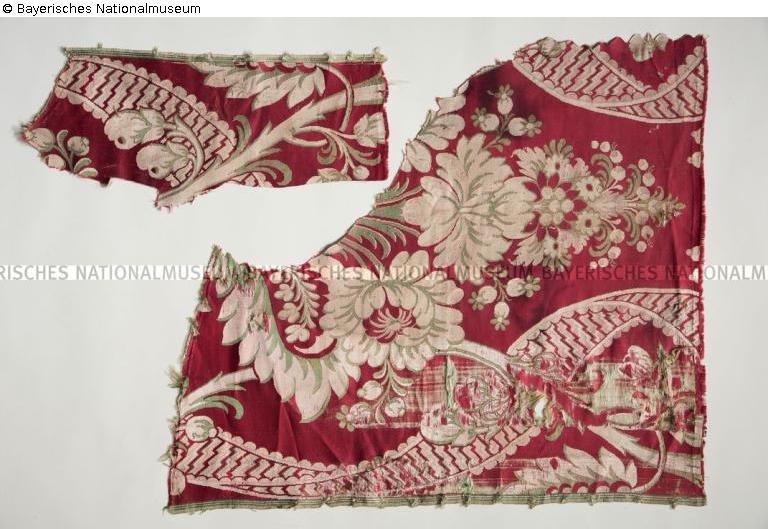 Überweisung 1965 (?) Evtl.: Freistaat Bayern. Gemäß der Vereinbarung vom 06.12.1960 zwischen der Bundesrepublik Deutschland und dem Freistaat Bayern. 1965 dem Bayerischen Nationalmuseum (BNM) überwiesen.Von der Treuhandverwaltung von Kulturgut (TVK, tätig von 1952 bis 1962), übernommen vom Central Collecting Point (CCP) München aus dem Besitz/der Vermögenseinziehung von Hermann Göring (1893-1946). Provenienzforschung: nach mündlicher Überlieferung gehören die BNM Inv.-Nrn. 2012/140.1-2012/196 und 2012/246 zu den nicht inventarisierten, 1965 dem BNM vom Freistaat Bayern überwiesenen Textilien aus der 'Sammlung Göring'; für den 'Göring'-Kontext spricht der mit den weißen Papieraufklebern bei den aus der 'Sammlung Göring' stammenden BNM Inv.-Nrn. 2012/42 und 2012/108 identische Papieraufkleber bei BNM Inv.-Nr. 2012/193, darauf maschinenschriftlich mit blauer Farbe "BROCCATELLO GE[WEBE ...?]", identisch mit 2012/42: "BROCCATELLO UNERGRUND[sic] HELLGRAU/M[IT] BLÜHENDEN MEHRFARBIGEN U[ND]/GRAUEN ZEICHNUNGEN", 2012/54: "BROCCATELLO UNTERGRUND GRÜN/PUNKTIRT[sic] U[ND] SCHATTERT[sic] M[IT] BLUHENDEN[sic]/MEHRFARBIGEN ZEICHNUNG[sic]", 2012/108: "BROCCATELLO KARMOISINROT[sic]/UNTERGRUND GELB GOLD[sic]". Evtl. zugehörig zum 'Göring'-Textilkonvolut mit der Münchner Nummer 7400 = BNM Inv.-Nrn. 65/216-257, 65/259-272: laut Restitutionskartei (Eingangskarteikarte der Münchner Nummer 7400; Bundesarchiv, B323/659): "Herkunft: 1941/42 aus Italien an H. Göring/(Auskunft Hofer)" [= Textilien aus der 'Sammlung Göring' BNM Inv.-Nrn. 65/166, 65/167, 65/174, 65/176.1-3, 65/179, 65/181-182, 65/184, 65/187, 65/189, 65/191-192.2, 65/194-195, 65/198, 65/200, 65/202, 65/212, 65/214.1-257, 65/259-272, 2012/48-49, 2012/54-55, 2012/70-72, 2012/97, 2012/106, 2012/108]; "Gegenstand: Sammlung von italienischen Seidengeweben/und Brokaten auf 78 Kartons und 2 Petit Point/Stickereien in[sic] Kartons". Laut Restitutionskartei (Ausgangskarteikarte der Münchner Nummer 7400; Bundesarchiv, B323/659): "Subject: A Collection of Jtalian[sic]/silk weavings and brocades/on 78 cartons and 2 petits/points[sic] embroideries/on cartons"; "History and Ownership: All items are of Jtalian[sic] origin, also the description in/type writing - although in German - surely is written in/Jtaly[sic], because it is the same type as used on textiles in 7399/7398 etc., which were bought in Jtaly[sic] legally (after Hofer)". Laut Alte Ministerpräsidentenkartei (Karteikarte der Münchner Nummer 7400; Bundesarchiv, B323/767): "A collection of Italian silk/weavings and brocades on/78 cartons and 2 petit points[sic]/embroideries en[sic] cartons"; "History and Ownership: All items are of Italian origin, also the description in type-writing,/although in German - surely is written in Italym[sic] because: the same type as use[sic]/on textiles in 7399/7398 a.s.o. which were bought in Italy legally/(after Hofer)"; Walter Andreas Hofer (1893-?1971) ist in der "ALIU List of Red Flag Names" verzeichnet: "Hofer, Walter Andreas. Nuremberg. Director of the Goering Collection, and Goering's chief purchasing agent. In custody of US Chief of Counsel, Nuremberg". Eingang/Receipt (Central Collecting Point München): 06.08.1945; Ausgang/Issue (Central Collecting Point München): 10.06.1949 (Ministerpräsident). Am 29.01.1957/23.02.1957 von der Treuhandverwaltung von Kulturgut über die Finanzmittelstelle München des Landes Bayern gemäß Übertragungsurkunde Nr. 69 (Textilien aus dem Nachlaß von Hermann Göring) aus dem Besitz/der Vermögenseinziehung von Hermann Göring (1893-1946) in das Eigentum des Freistaats Bayern übergegangen: Nr. 112 [= BNM Inv.-Nrn. 65/216-257, 65/259-272] der Übertragungsurkunde Nr. 69 (Textilien aus dem Nachlaß von Hermann Göring). Am 01.02.1961 als 'Überweisung aus Staatsbesitz' an die Bayerischen Staatsgemäldesammlungen; von dort am 26.02.1965 vom Bayerischen Nationalmuseum übernommen. Aus der 'Sammlung Göring' (?): aus dem 'Göring'-Textilkonvolut mit der Münchner Nummer 7400 sind dem BNM vom Freistaat Bayern folgende Objekte überwiesen worden (Münchner Nummer = BNM Inv.-Nr.): 7400 = 65/216-257, 65/259-272; zumTextilkonvolut mit der Münchner Nummer 7400 gehören eventuell auch die BNM Inv.-Nrn. 2012/140.1-2012/196, 2012/246. Vorprovenienz (Münchner Nummer 7400), nach Auskunft von Walter Andreas Hofer (1893-?1971): Italien [vgl. BNM Inv.-Nrn. 65/217-257, 65/259-272]. Zu unbekanntem Zeitpunkt (1941/1942 ?) aus unbekanntem Eigentum/Besitz in die 'Sammlung Göring' (?). Aufgrund der Provenienz- und Überlieferungslücke(n) kann ein NS-verfolgungsbedingter Entzug nicht ausgeschlossen werden./A.G., 2018