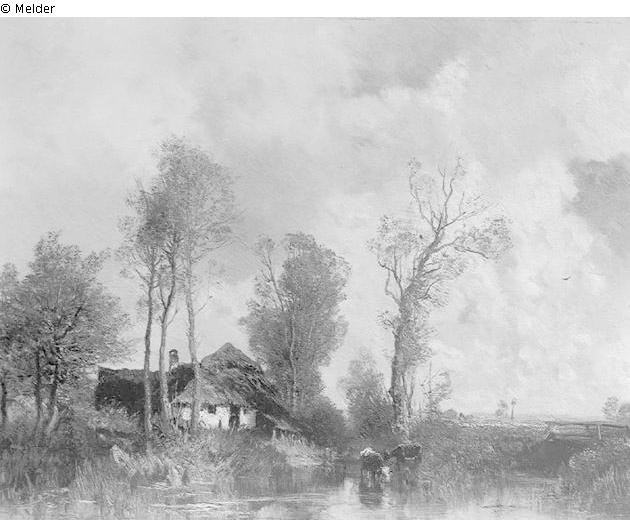 The painting shows a farmhouse in a flat landscape. In the foreground is a pond with two cows standing by it. Behind it, in the left part of the picture, a white farmhouse is depicted, surrounded by trees and lush vegetation. In the background is a flat landscape under a cloudy sky.