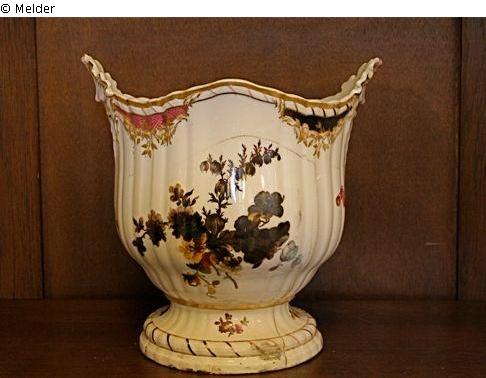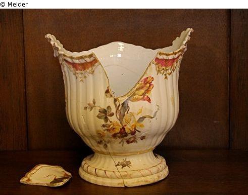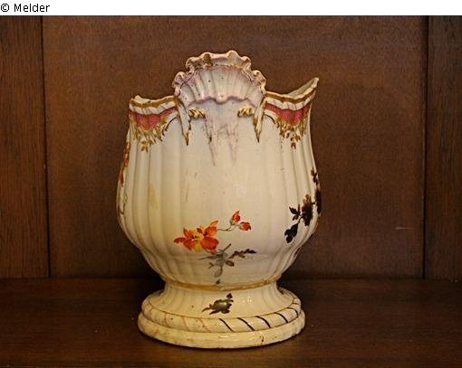 Oft gebrochen (alte und relativ neue Brüche, 6 Teile) und geklebt. Brandspuren in Malerei und Vergoldung; Malerei insbesondere auf einer Seite stark verfärbt.