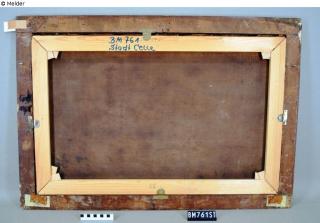 Landscape with different figures. In the foreground women washing their clothes. On the left side a rock with a waterfall. Through the leafy trees on the right side view to a place with a church tower. On the back with yellow chalk written the auction number of Hans W. Lange (69) and remains of two old labels. At the top of the ornamental frame two more numbers written with chalk, probably 327 and 200. Counterpart to BM00761/ST.