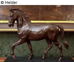 The bronze sculpture depicts a striding horse with its left forehand slightly raised.