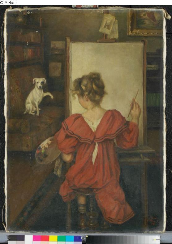 Interior (Girl in front of an easel with a small dog)
