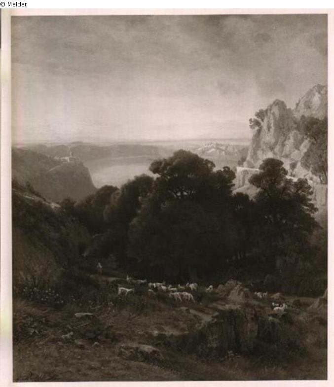 Found-Object Report | Object report Italian landscape with lake and goats in the foreground Lost Art-ID531400 Previous Next Artist / Creator Rodde, Carl Gustav Birth 1830.08.29, Danzig Death 1906.03.01, Berlin-Großlichterfelde Place of activityBerlin TitleItalian landscape with lake and goats in the foreground Dating1880Object typePaintingGroup of reported objectsPaintingMaterial / TechniqueOil ; Canvas / painted Height 127.00 cm Width 104.00 cm Inventory numberMü. 11332; aa 1812Description View from top of the grassland with the goats, behind trees that covered the lake. Left a castle, right high rocks. Read more Read less Published since23.12.2015 Contact Bundesamt für Auswärtige Angelegenheiten Kirchhofstraße 1-2 14776 Brandenburg Germany E-MailI-AU-RL@bfaa.bund.de
