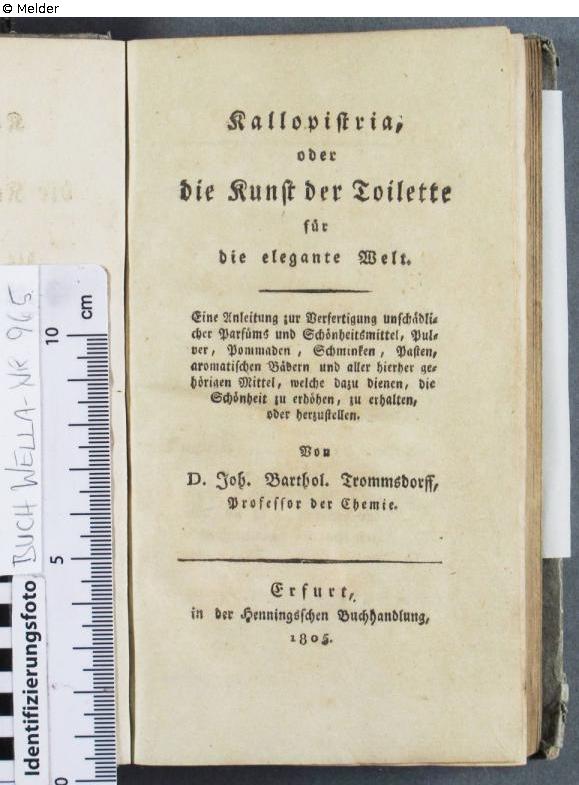 Found-Object Report | Object report Kallopistria oder die Kunst der Toilette für die elegante Welt: eine Anleitung zur Verfertigung unschädlicher Parfüms .. Lost Art-ID622866 Previous Next Author Johann Bartholomäus Trommsdorff Publisher Hennings TitleKallopistria oder die Kunst der Toilette für die elegante Welt: eine Anleitung zur Verfertigung unschädlicher Parfüms ..Place of releaseErfurt Date of publication1805Object typeLibrary objectsGroup of reported objectsLibrary objectsSignatureWe-GR 965 Description on the pastedown a bookplate, 110 x 74 mm: Ex Libris K. H. Tautenhayn Read more Read less Provenance K. H. Tautenhayn; [...]; 17.07.2001 - 2013: Museum Wella Darmstadt, purchased from Buch- und Kunstantiquariat Hans Horst Koch, Berlin; 2013: donated to the HLMD Read more Read less Published since22.07.2024 Contact Hessisches Landesmuseum Darmstadt Friedensplatz 1 64283 Darmstadt Germany Phone+49 6151-3601-200Fax+49 06151-1657199E-Mailinfo@hlmd.deHomepagehttps://www.hlmd.de/de/ Contact Dr. Martin FaassPositionDirektorPhone+49 6151-3601-001