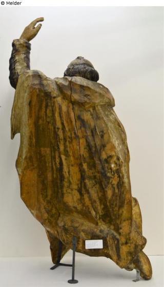 Full plastic, flattened at the back. The saint, kneeling in a monk's gown and gilded gown. The left arm is raised, the right hand is placed on the upper body. A kind of stole falls down a broad area at the front of the figure.