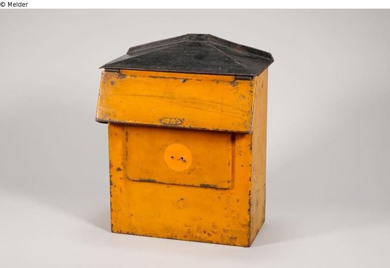 Wall mailbox with wide flap on the front, lock with key underneath, roof bevelled and black. Finnish manufacturer.