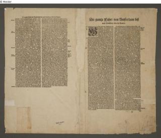 The inscription in a cartouche is in the upper map on the left: "NIEUWE CAERTE / waerinne vertoont wordt / de gantsche Vaert van / Amsterdam over de / WATTEN tot de stadt / Hamborch toe. / Den liefhebberen enden rey= / sende luyden tot nut en vermaeck / int coper gesneden door / Ian Ianßen." In another cartouche in the upper map at the bottom right, the scale is given as "1 Milliarium Germanicum communium". It is clearly soiled, has foxing and is severely torn in several places. The reverse side is printed with writing and shows that the map was taken from a bound atlas. There are the following handwritten markings on it: