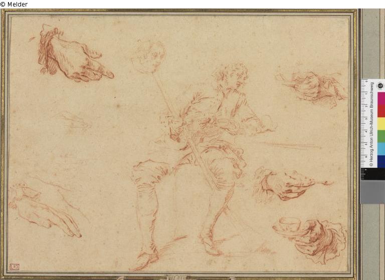 Study of a sitting young man with teacup and rifle; five hand studies; head study. Drawing on paper. - Below left collector's stamp in red: LsD [Louis Deglatigny (Marke Lugt 1768 a)]. Upper left verso with pen in black: Collection F. Bohler | vente a Paris vendredi 23 fevrier 1906 | No. 25 Feuille d'étude; below with graphite: "Collection [Collation?] (No. 181) | app... [aff..] A M [?] [deleted: chez] Knoedler a New York | Suite de quatre dessus de porte | reprod. 'Lancret' par G. Wildenstein 18.000." Upper right on the passe-partout in pencil (cut off at the top): 229 (underlined) [?] [Original after the hand drawing see Wildenstein, Georges: Lancret, Paris 1924, p. 120, no. 745: Le petit déjeuner avant la chasse, fig. no. 181]. - Fig. of the Lancret drawing in Rosenberg, Pierre/Stewart, Marin C./ Lefrançois, Thierry: French Paintings 1500-1825. The Fine Arts Museums of San Francisco, San Francisco 1987, p. 205, with part of an oval stamp at the right margin in the middle, readable: Pho[...?] / Lo[...?].