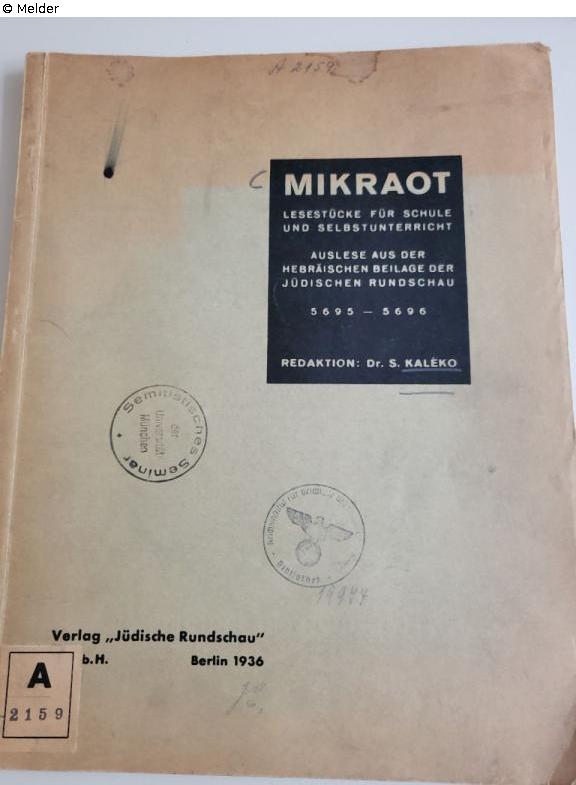 Found-Object Report | Object report Mikraot: Lesestücke für Schule und Selbstunterricht Auslese aus der hebräischen Beilage der Jüdischen Rundschau 5695 - 5696 Lost Art-ID632702 Previous Next Editor Kaléko, S. Publisher Jüdische Rundschau TitleMikraot: Lesestücke für Schule und SelbstunterrichtAdditional titleAuslese aus der hebräischen Beilage der Jüdischen Rundschau 5695 - 5696Place of releaseBerlin Date of publication1936Object typeBookGroup of reported objectsLibrary objectsSignaturekeine Signatur, nicht im OpacDescription stamp "Reichsinstitut für Geschichte des neuen Deutschlands" (A2159/19974). Read more Read less Published since28.10.2025 Contact Ludwig-Maximilians-Universität Institut für den Nahen und Mittleren Osten Bibliothek Veterinärstr. 1 80539 München Germany Phone0049-89-2180-3039Homepagehttps://www.naher-osten.uni-muenchen.de/institut/bibliothek/index.html Contact Prof. Dr. Ronny VollandtPositionProfessor für JudaistikE-Mailronny.vollandt@lmu.de