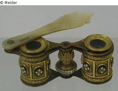 Messing, vergoldet, Perlmutt, Perlen, Email; Fernglas mit verstellbarem Mittelgelenk; Okularhüllen mit emaillierten, perlenbesetzten Medaillons, Perlmuttgriff; Auf der Umrandung der Augenlinse "par brevet d` invention"