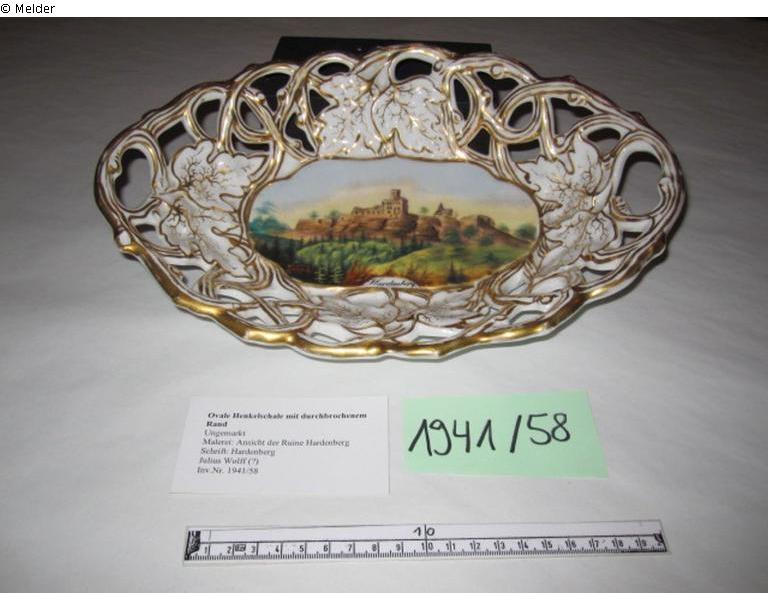 The richly decorated lattice shell shows a view of Hardenberg Castle on the bottom. It has no porcelain mark. The decoration with ivy vines refers to the porcelain manufactory Carl Tielsch in Altwasser, today Stary Zdrój in Poland. In the 1850s, numerous porcelain painters from Göttingen obtained cups and plates from this manufactory and then painted them with Göttingen motifs.