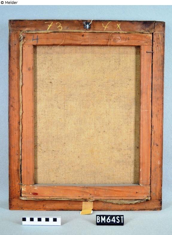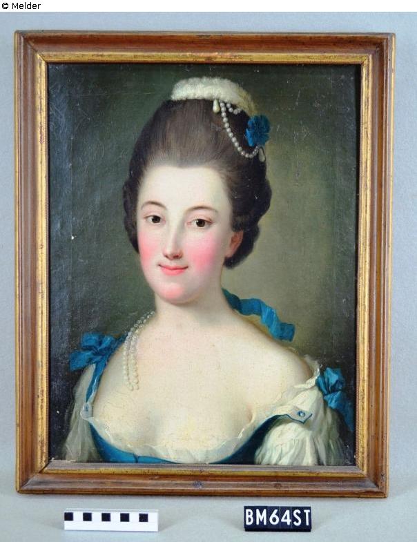Bust of a young woman with her upper body slightly turned to the left, her gaze slightly turned to the right. She wears black hair, which is decorated with pearls and a textile blossom. Her blue and white dress is decorated with bows. On the back of the painting is an auction number by Hans W. Lange (73). Counterpart to BM00063/ST and BM00066/ST.
