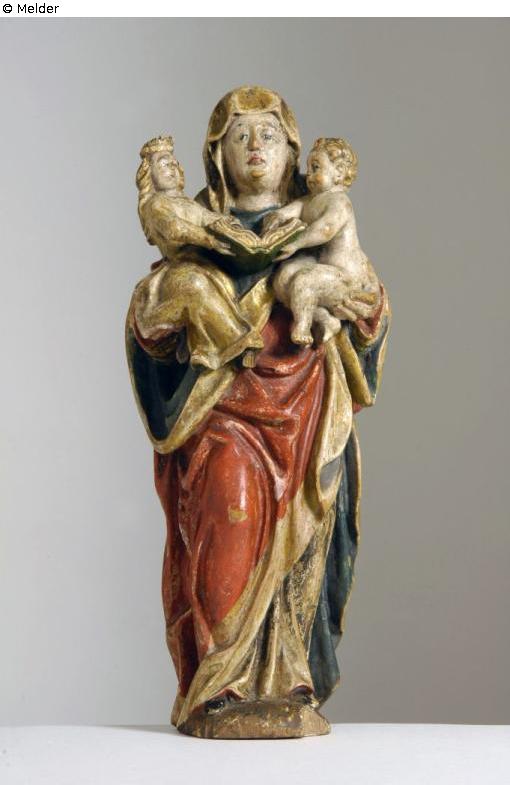 Depicted is Anna, the mother of the Virgin Mary, who is standing and holding her daughter Maria, who is depicted in a childishly reduced manner, on her right arm and carrying the naked Christ child on her left arm. Anna is characterized by her wide cloak with a head veil as a matron, she holds her head up and looks straight ahead, facing the viewer, she is frontal aligned; Mary and the Christ Child sit opposite each other and lay a hand on the pages of the open psaltery as a sign of their literacy, while Christ, with a bowed upper body, strives towards Mary, giving way in astonishment to what Christ's reading of the scriptures to Mary is interpreted to mean; Representation in the typical iconography of late gothic, but in the garb of the early Baroque (drape all clothes) and open hair of Mary.
