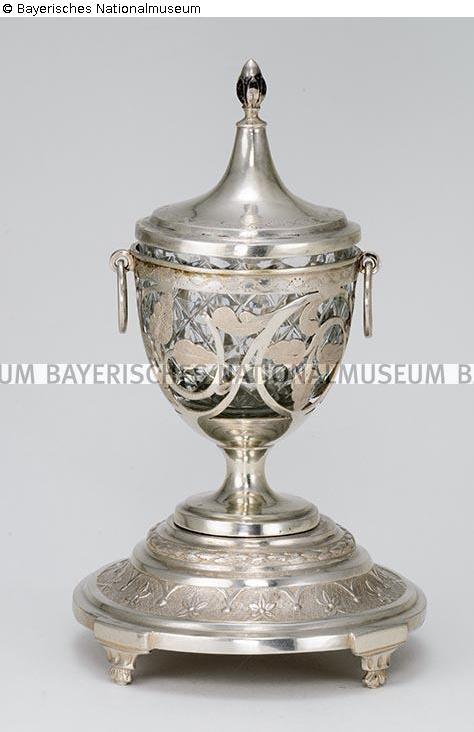 Findings: On the underside of the base of the silver stand: maker's mark 'CFT in transverse rectangle (with beveled corners)', for Christian Friedrich Temler (master 1796, died 1829), probably the hallmark is a variant of the master's mark; Hallmark 'Pyr over R in high oval', for Augsburg, 1806-1807; handwritten with red color "39/120" (Inv. No. of the Bavarian National Museum)./A.G., 2018