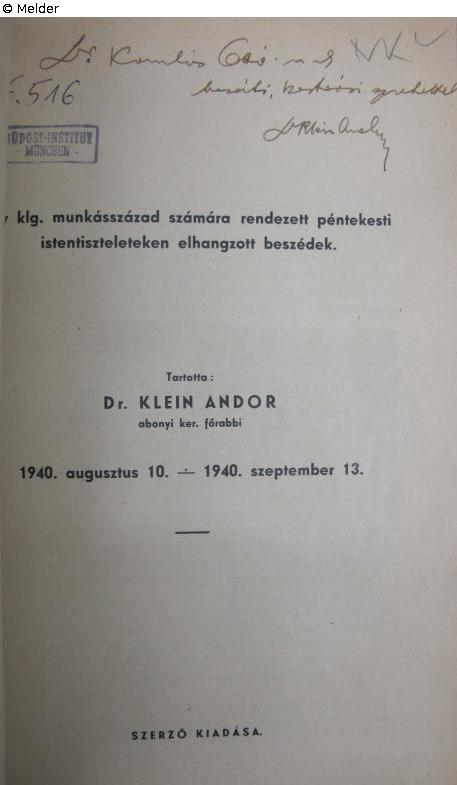 Found-Object Report | Object report Testvérem várlak! A magyarzsidó lélek szava ezerkilencszáznegyvenben Lost Art-ID623531 Previous Next Author Andor Klein Publisher Selbstverlag TitleTestvérem várlak! A magyarzsidó lélek szava ezerkilencszáznegyvenbenPlace of releaseSzeged Date of publication1940Object typeBookGroup of reported objectsLibrary objectsSignatureW 02/16.516Description 8°, gift of the author to Dr. Ottó Komlós Read more Read less Provenance Suspicion of looted property, 1984 Südost-Institut Munich (Michael Schwartz estate) Read more Read less Status restituted Published since08.10.2024 Contact Leibniz-Institut für Ost- und Südosteuropaforschung Bibliothek Landshuter Str. 4 93047 Regensburg Germany Homepagehttps://leibniz-ios.de/bibliothek/ueber-die-bibliothek Contact Tillmann Tegeler, M. A.PositionArbeitsbereich Bibliothek und elektronische Forschungsinfrastruktur Leiter des ArbeitsbereichsE-Mailtegeler@ios-regensburg.de