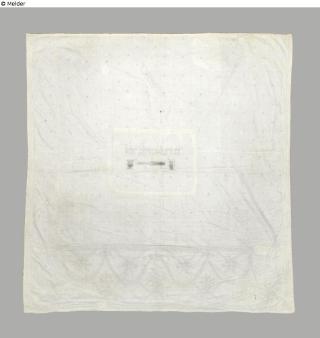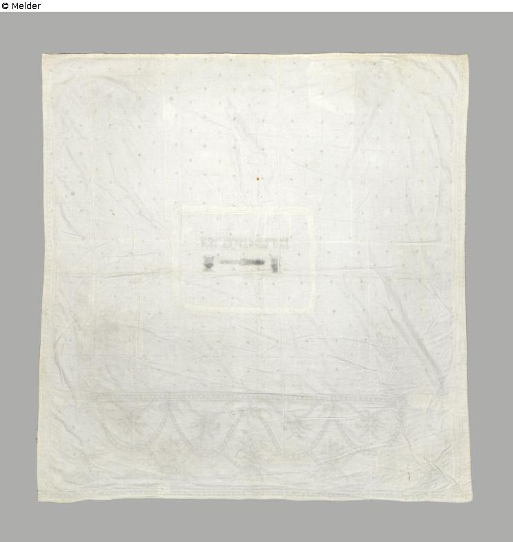 White circumcision curtain (Brit Milah curtain) made of linen with an embroidered pattern of alternating circles and crescents and a surrounding frame of interlocking chain links. In a frame in the centre is the embroidered Hebrew inscription "Zechor Berit Avraham" (Eng. "Remember the covenant with Abraham") as well as two cups and a knife used in the circumcision ceremony. Curtains of this kind were often donated on the occasion of a circumcision and then hung in the synagogue in front of the Torah shrine.