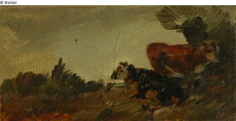 Motiv: Vor einer Kopfweide am rechten Bildrand steht eine rotbraune Kuh, links vor ihr lagert eine schwarze Kuh. Links im Hintergrund ragen braungrüne Büsche unter dem grauweißen Himmel auf. Werkvz.-Nr. 635. Verso drei Aufkleber mit den handschriftlichen Bezeichnungen: 1.: AR 1285; 2.: AR 571; 3.: 1171 b. Des weiteren befinden sich auf der verso-Seite folgende handschriftliche Bezeichnungen: 1.: Rum 13 (?) 2.: B. 38; 3.: 25 (gerahmt von blauem Dreieck