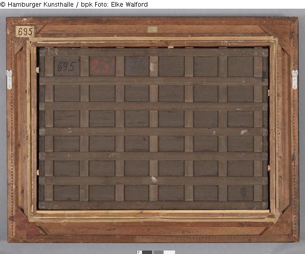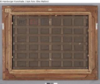 Wooden panel top left: a) black pencil: "695" [Inv.No. HK]; b) on the right with red colour: "251." [Numerus currens of the auction Schlüter, 27.9.1941]; c) on the right side upside down with blue pencil: "1718"; below a) with blue pencil: "No. 9506./Sp./]; on three places on the back wooden panel on the right side small scraps of paper probably from labels formerly attached to this place