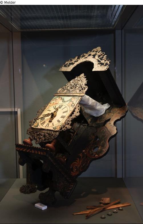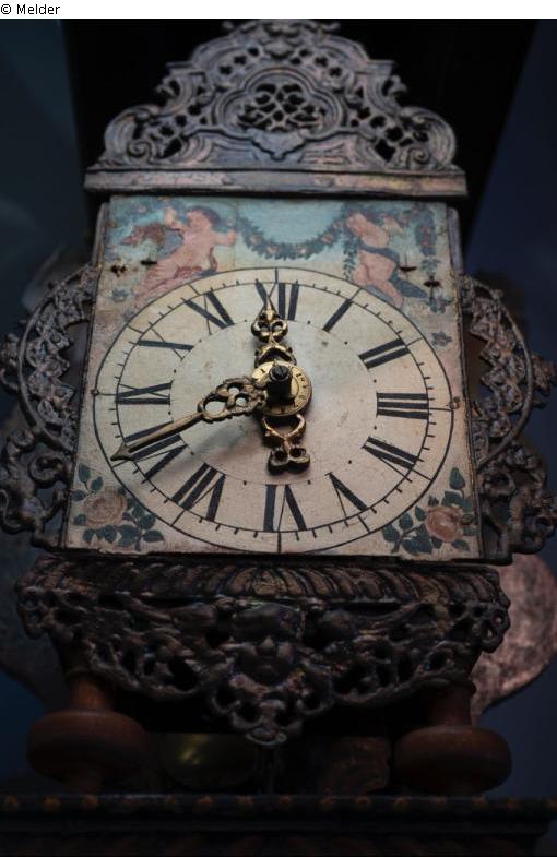 So-called "Seewiefkes Clock" or "Sea Woman Clock". The clock is a Frisian chair clock with a brass clockwork with spindle escapement, pendulum and chain hoist. The case consists of a wooden back wall, a wooden cover with an indented arch and a dial plate framed by decorations. The back wall is decorated on the side with two mermaids cut out of a wooden board and painted. The cover is faced with decorations cast in metal, which also frame the dial. The dial is painted with Roman numerals and is crowned by two putti holding a garland of flowers.