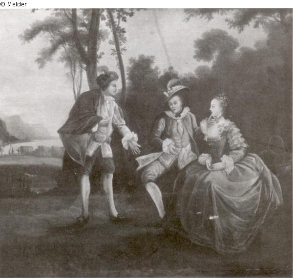 Sitzendes Paar mit einem stehenden Mann in Unterhaltung, im Hintergrund Fluss mit einer am Ufer stehenden Gondel, Felslandschaft, Supraporte ; Blauer Führer, Saal 45, S. 53