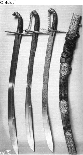 Die Griffe sind mit rotem Samt und goldenen, geflochtenen Schnüren umwickelt. Daran befinden sich Kappen in Form von Hundeköpfen, eiserne vegoldete Kreuze und Ketten, die Kreuze und Hundeköpfe miteinander verbinden. Die Klingen sind unterschiedlicher Art: z.T. mit türkischen Inschriften, z.T. europäischer Provenienz. Die Scheiden sind mit rotem Samt bezogen, Ortband, Mundblech und Mittelbänder aus Silber sind mit Steinen besetzt (Landstein, Türkis, Amethyst).